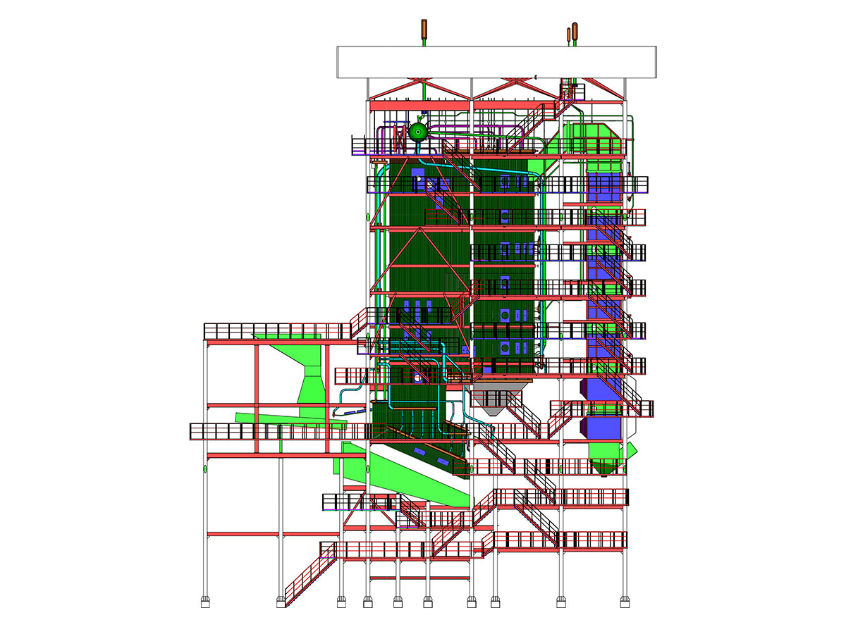 d、流化床鍋爐:采用后傾式布風(fēng)板加固,保證大塊固化物順利排出;采用外置式高溫過熱器,延長高溫過熱器使用壽命;布置大節(jié)距尾部受熱面,較少管排堵塞。